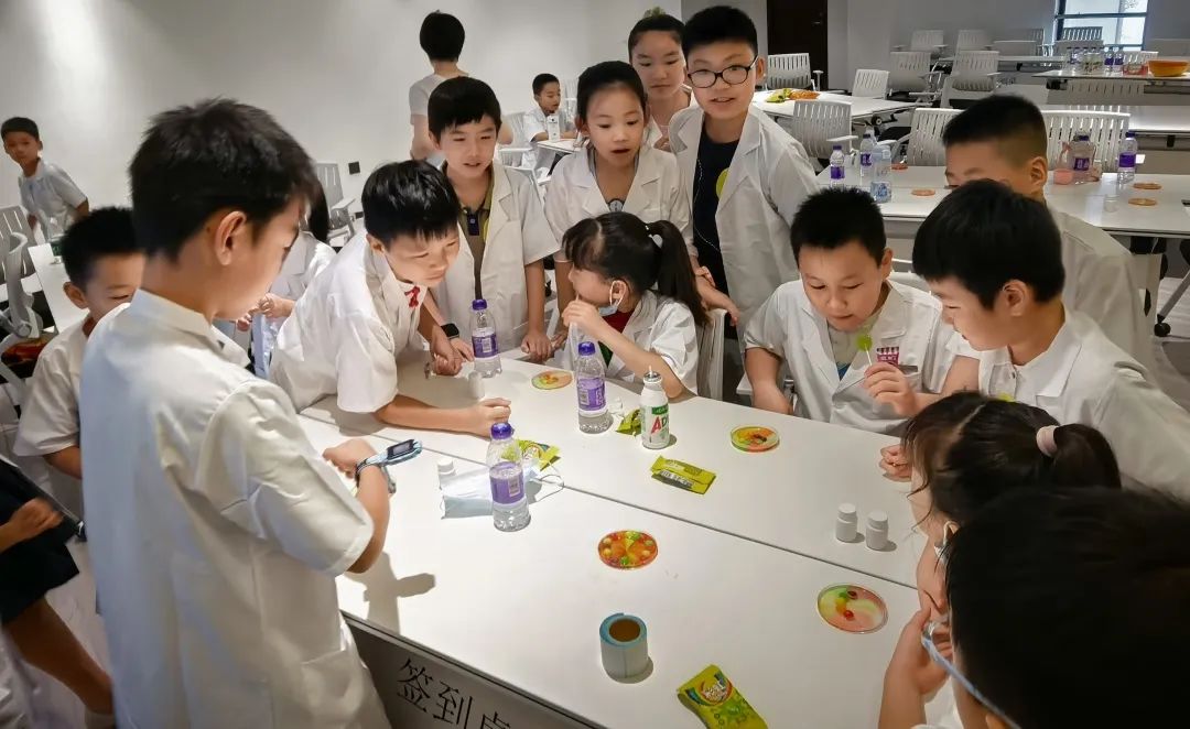 化药研发中心制剂部何坤杰等同事带领孩子们体验 “药丸” 制作流程。孩子们亲手参与药粉称量、混合,在专业指导下完成药品压制,最后为自己制作的 “药丸” 贴上标签,小心翼翼地收入袋中留作纪念。与此同时,“维生素彩虹” 实验精彩上演,色彩在溶液中层层晕染,宛如绚丽的彩虹,让孩子们直观感受到化学的神奇魅力。之后孩子们入到药品生产车间参观了自动化生产线,更直观地了解药品的生产过程。