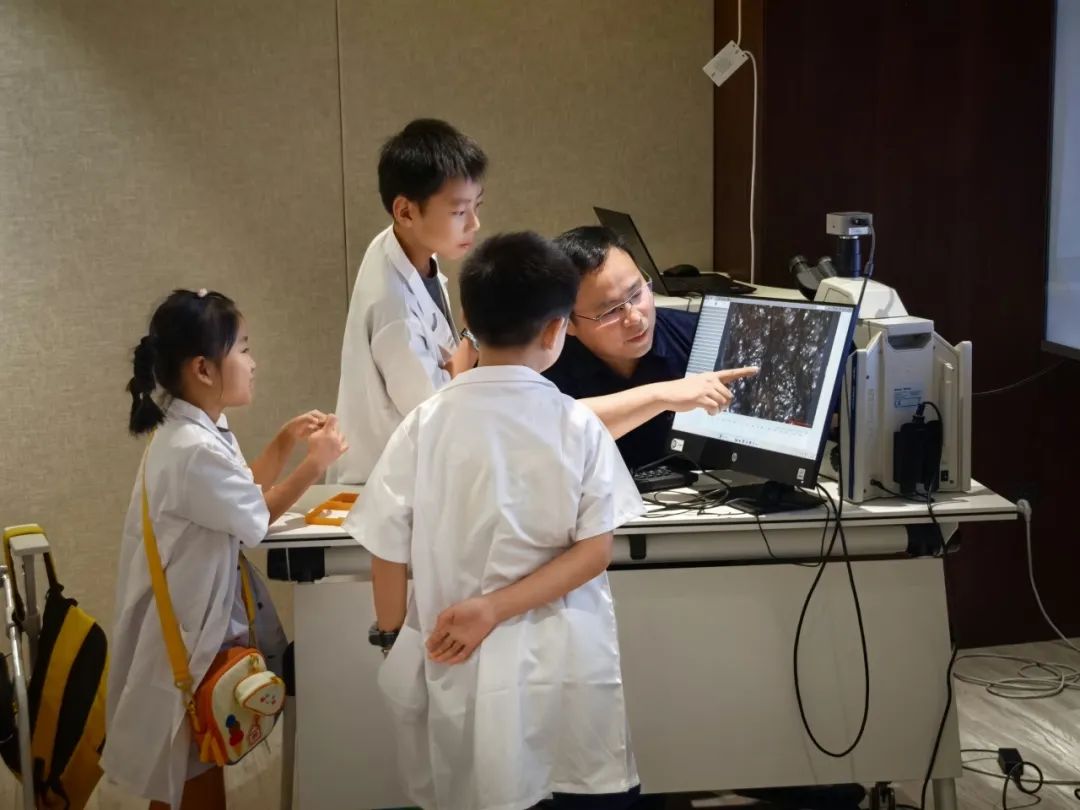 李涛博士用生动易懂的语言,为孩子们讲解了药物如何在人体内发挥作用,以及从发现到开发的漫长历程。随后,他指导孩子们操作显微镜,观察各类细胞的微观世界,当一个个形态各异的细胞在视野中显现时,孩子们不时发出惊叹声,对生命科学的好奇被深深点燃。